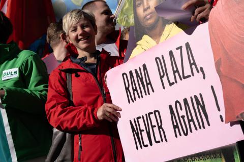 - Aux entreprises : si au Bangladesh, des avancées majeures en matière de sécurité des usines ont été obtenues en 10 années de mobilisations locales et internationales, nombreuses enseignes de mode refusent encore de signer l'Accord international, le programme de santé et de sécurité le plus efficace à ce jour pour améliorer les conditions de travail de centaines de milliers de travailleuses et travailleurs.
