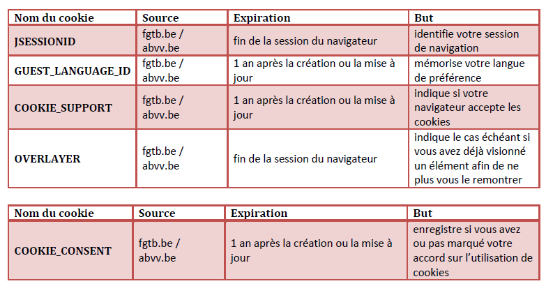 Le site de la FGTB Fédérale (www.fgtb.be) utilise plusieurs cookies. Ces cookies ne contiennent aucune autre donnée vous concernant que celles indiquées et aucune autre utilisation que celle indiquée n'en est faite. La nature et la finalité de chacun d’entre eux est expliquée ci-dessous :