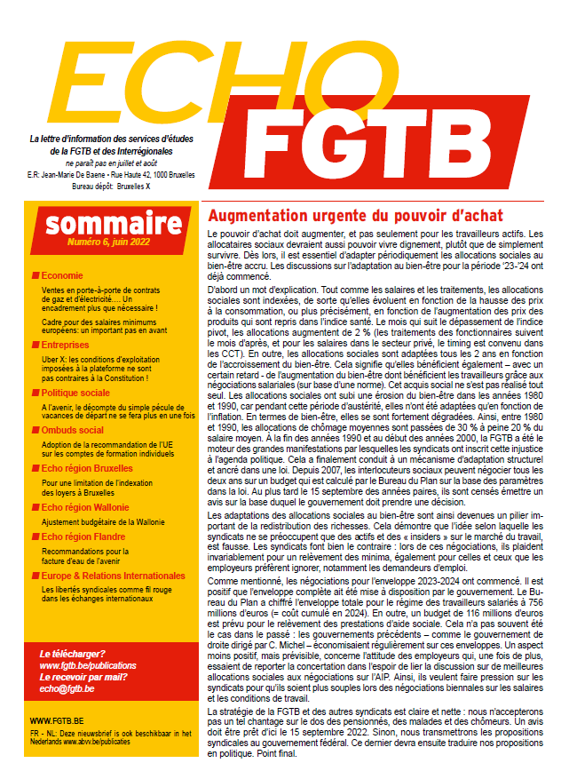 Augmentation urgente du pouvoir d’achat // Économie : Ventes en porte-à-porte de contrats de gaz et d’électricité…. Un encadrement plus que nécessaire ! // Cadre pour des salaires minimums européens: un important pas en avant // Entreprises : Uber X, les conditions d’exploitation imposées à la plateforme ne sont pas contraires à la Constitution ! // Politique sociale : A l’avenir, le décompte du simple pécule de vacances de départ ne se fera plus en une fois