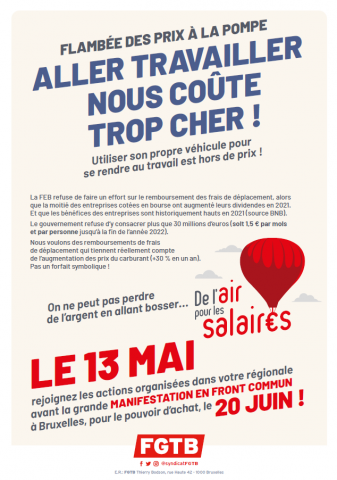 Aller travailler nous coûte trop cher ! Utiliser son propre véhicule pour se rendre au travail est hors de prix ! Le 13 mai, rejoignez les actions organisées dans votre régionale avant la grande manifestation en front commun du 20 juin.