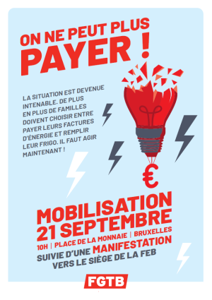 On ne peut plus payer. La situation est devenue intenable. De plus en plus de familles doivent choisir entre payer leurs factures d’énergie ou remplir leur frigo. Il faut agir maintenant ! La FGTB appelle à une mobilisation le 21 septembre - 10h, place de la Monnaie, Bruxelles. Elle sera suivie d’une manifestation vers le siège de la FEB.